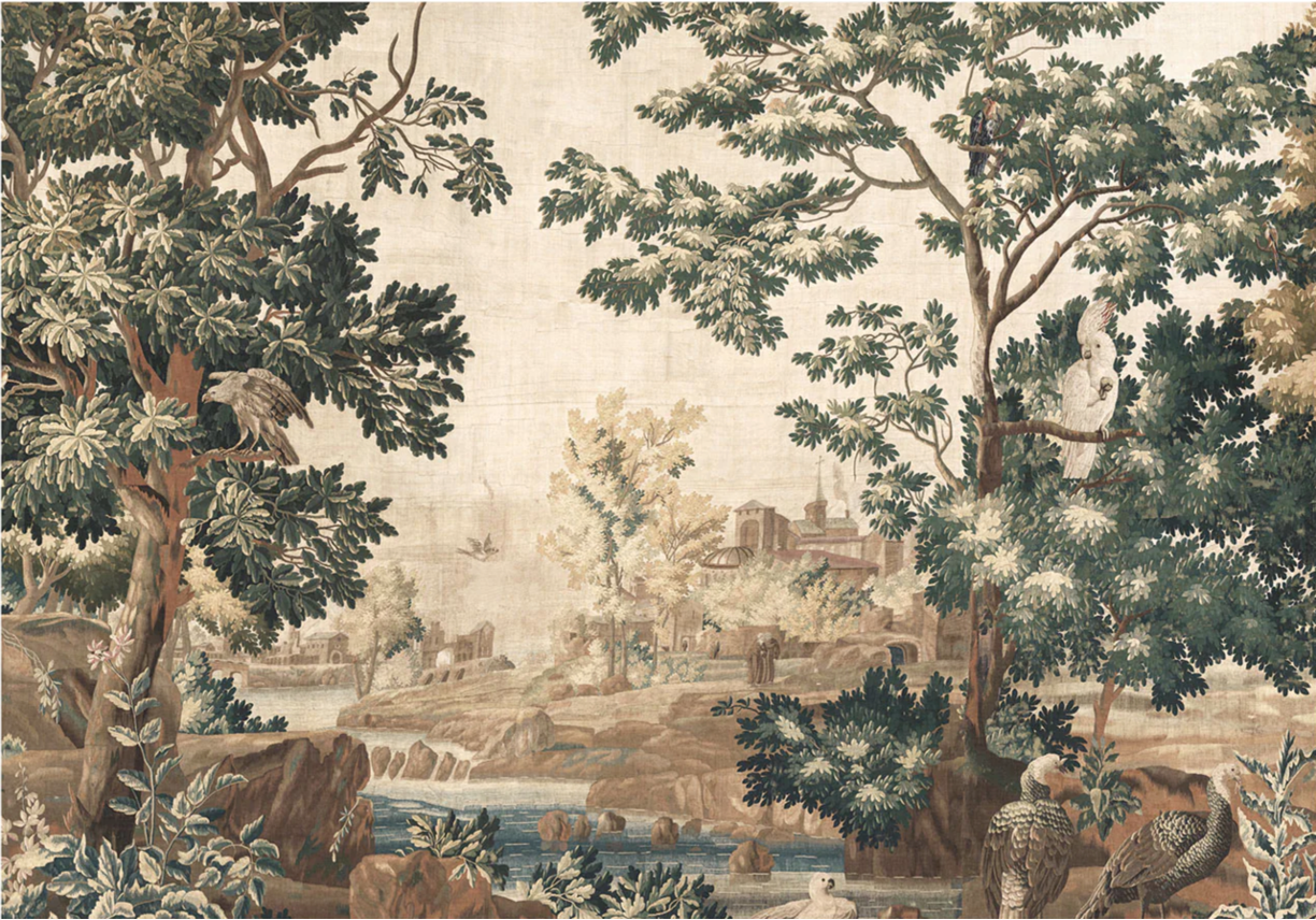 And finally, the rendering showing my design concept which includes an antique Steinway piano, equestrian paintings, a lush landscape wallpaper, olive green velvet drapery, a game table and a colorful rug.