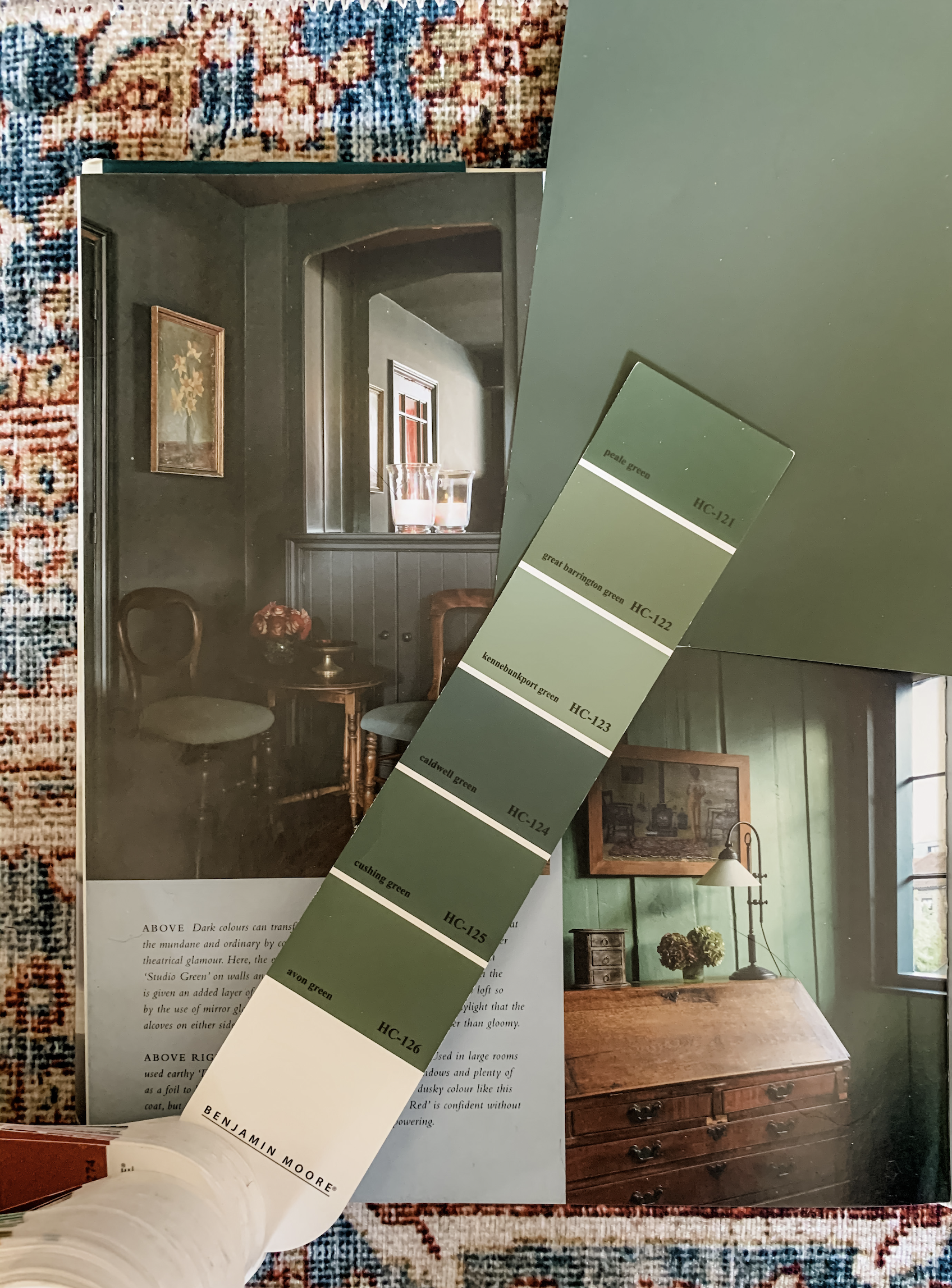 I narrowed it down to these options (although I could have looked at green paints for the rest of my life) and ordered large samples from Benjamin Moore. I taped them all over my walls and looked at them in the sunlight, in the shadows, on every wall, day and night.