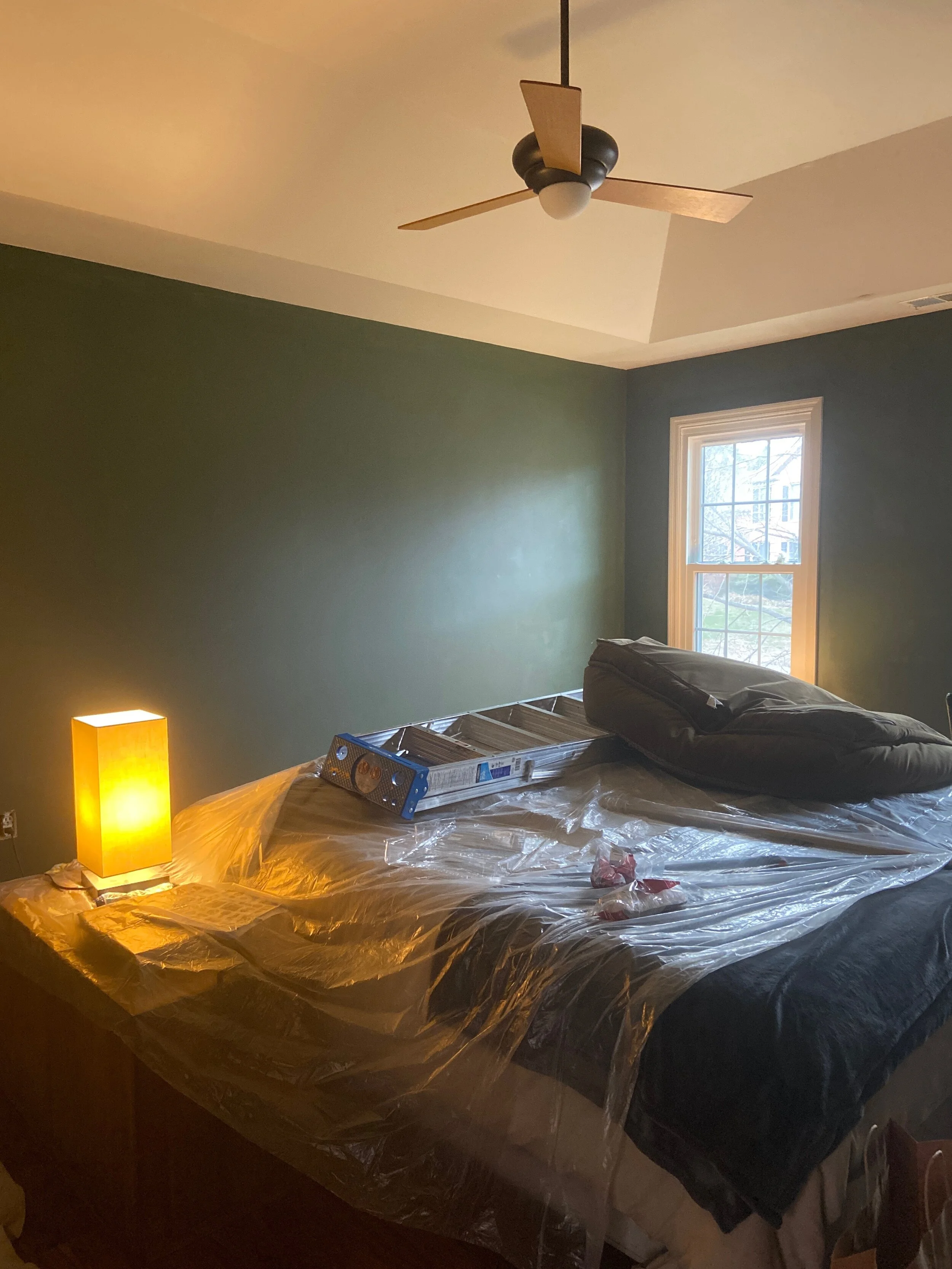 I wasn’t happy about it in the moment- in fact I was downright resentful that I had let my husband talk me into it- but now that it’s done I can say it was worth the pain. It makes the room feel taller without the harsh line separating the green wall and white ceiling. The room feels dark, cozy and cocoon-like.