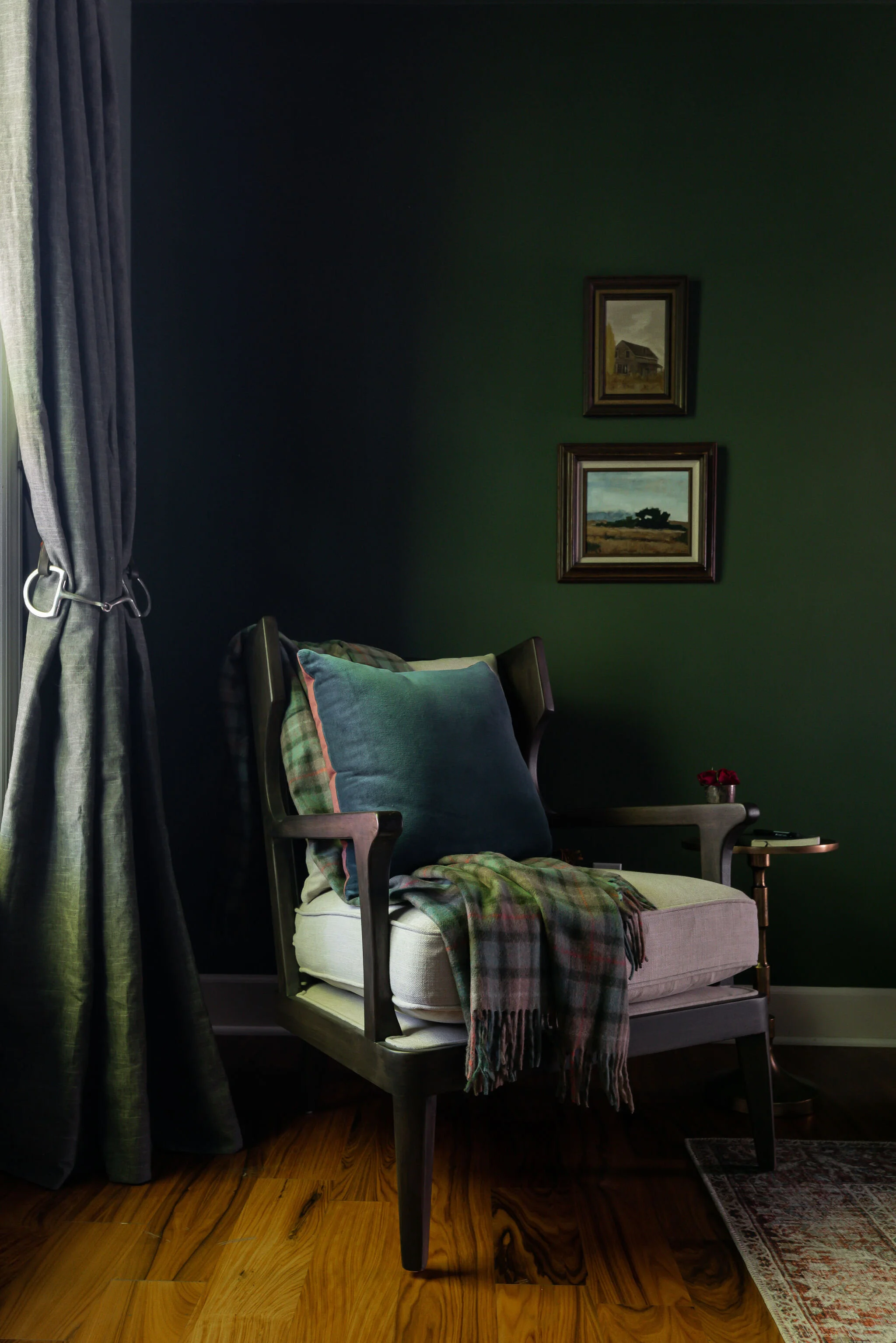 I knew that the room wanted a dark and cozy vibe, I just needed to find the perfect shade of green reminiscent of an old hunt club.