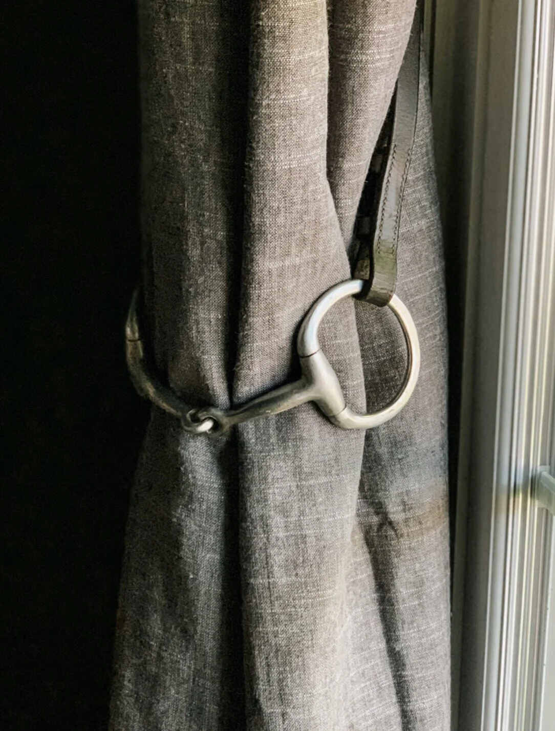 I had an idea to take apart Alice’s bridle and use the bit and reins as a drapery tie-back. In case you were wondering, yes I did clean the bit first. Also if you’re wondering how I achieved this effortless look, I’m sorry but I will not be pulling back the curtain on this one. (It involves several rubber bands and does not look very designer-y.)