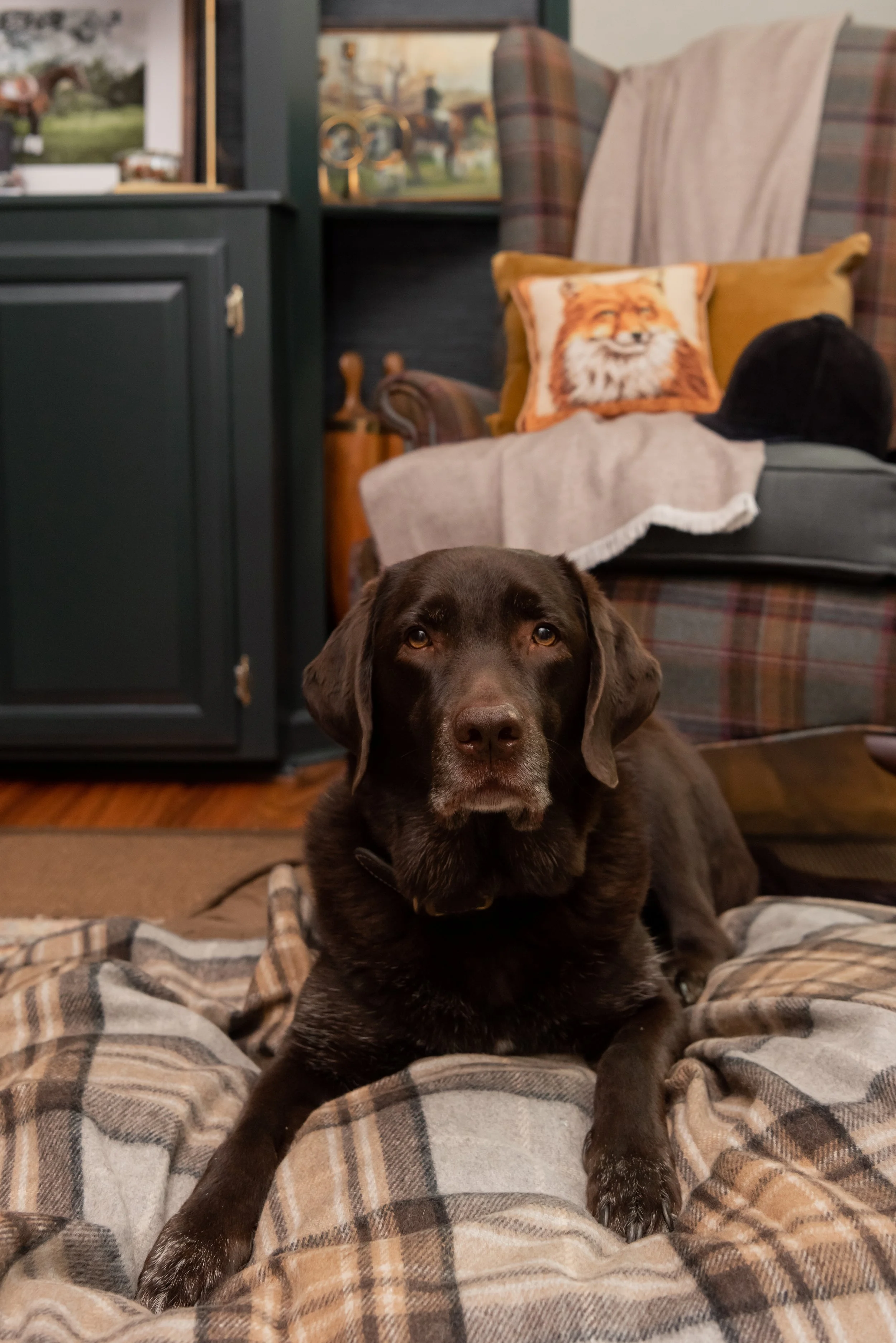 Remember my old wingback chair from 1981 that we saw in the “Before” post? Now it’s as good as new, dressed in Ralph Lauren wool tartan and Rogers & Goffigon linen. This is my favorite RL tartan and I have been hanging on to a sample piece, waiting for an opportunity to use it. It works perfectly with my alpaca herringbone throw blanket from Modern Equestrian Shop and my little needlepoint fox pillow from Macjac. Isn’t he just the cutest little addition to my equestrian room?