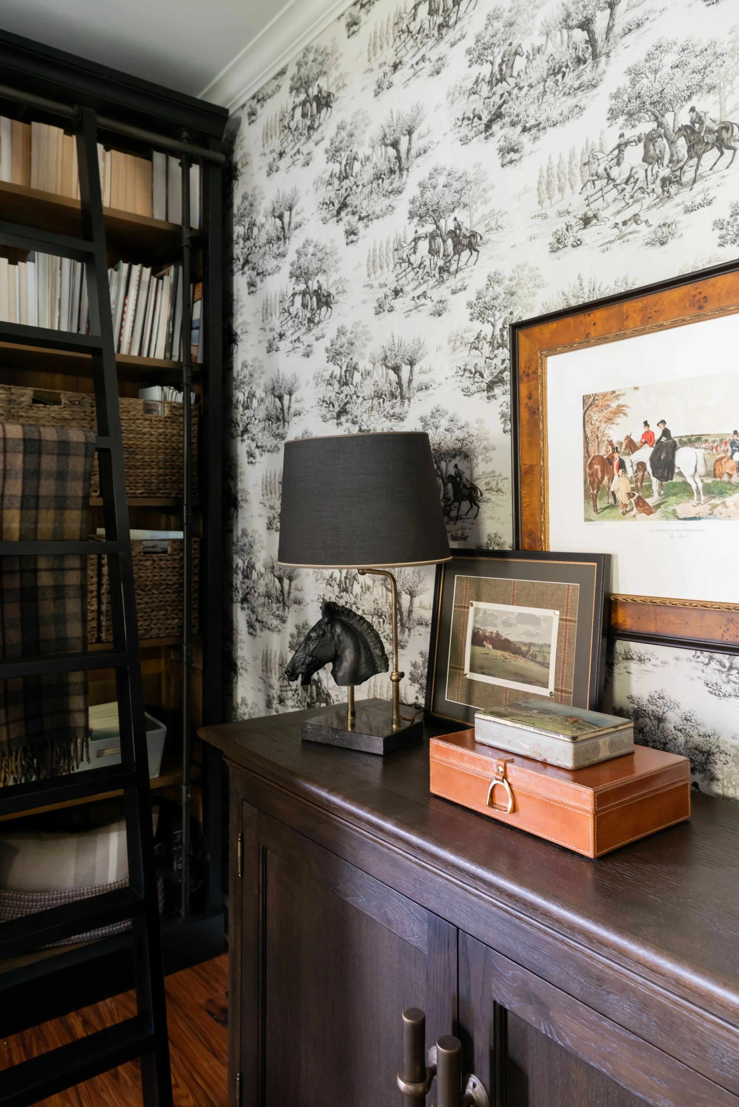 I always love incorporating a one-of-a-kind lamp in my designs. It’s a great way to add something unexpected. I found this stone sculpture lamp on a piece of marble on Chairish, one of the best sites to find unique items. It was in an antique shop in London called Ed Butcher Antiques, and it had to be rewired and shipped across the pond, just for me. With a black lampshade lined in gold, she stands strong against the black and white wallpaper. Yes, I said “she”. Can you see how her right ear is pinned back? Got to be a mare. If you‘ve had one, you know :)