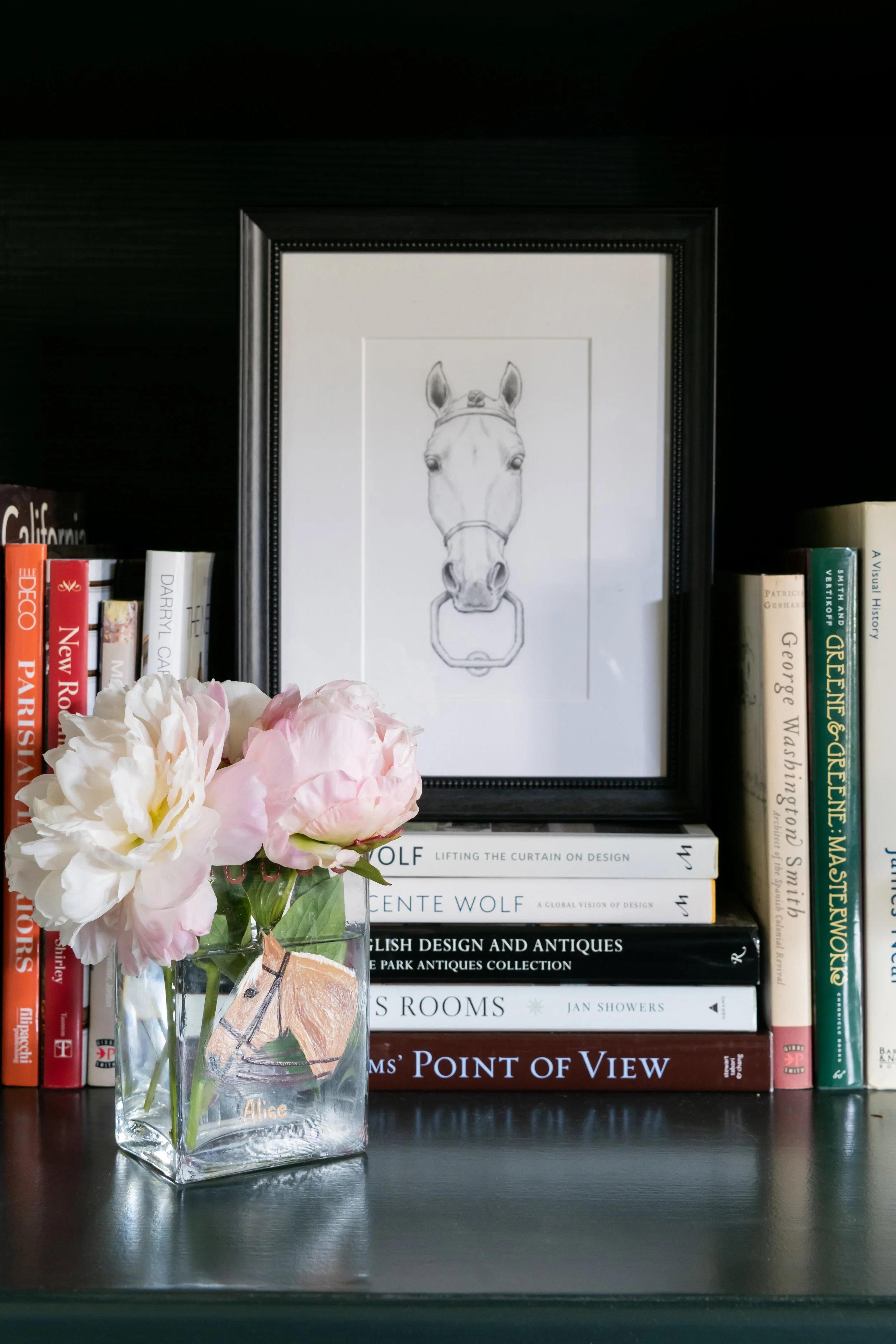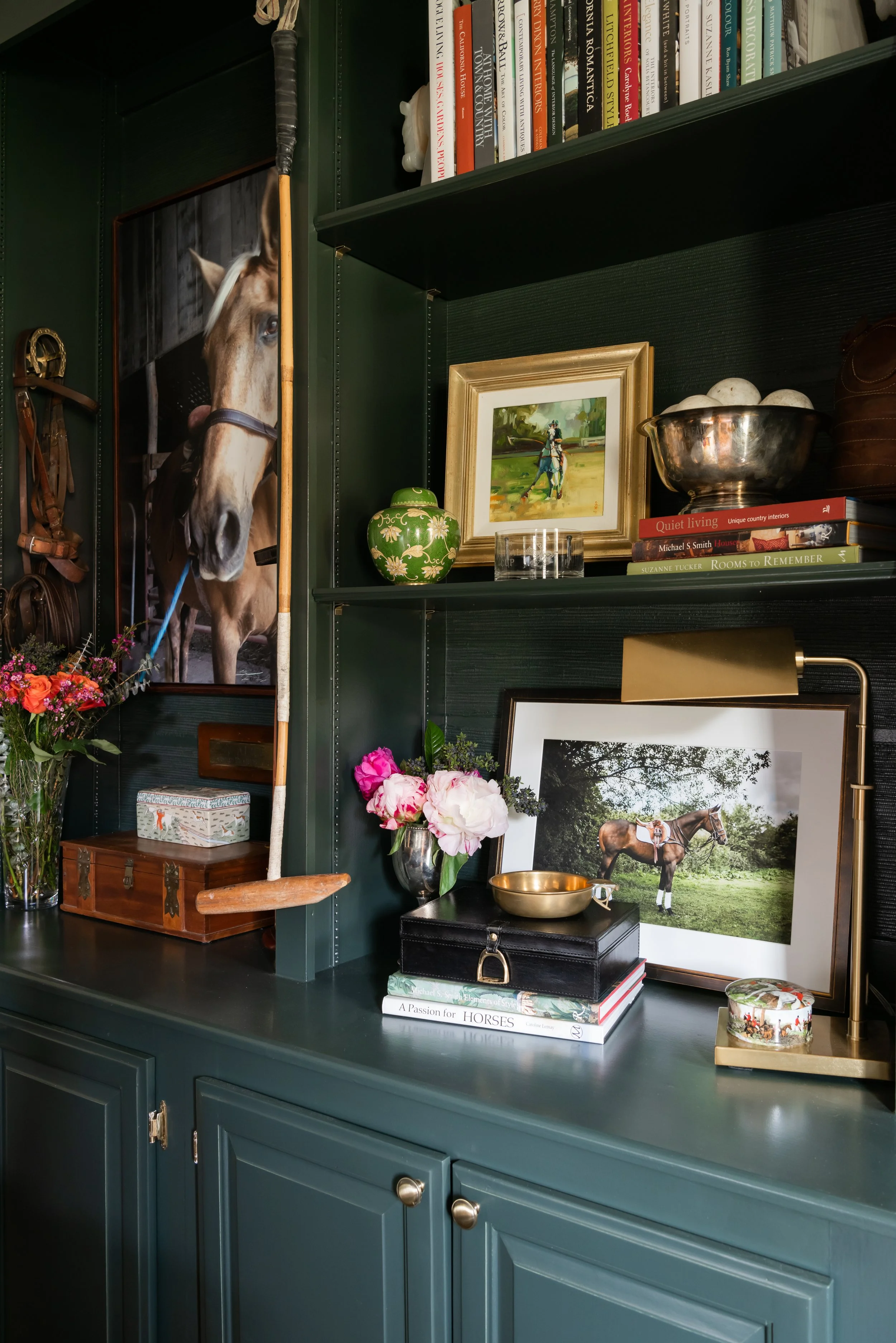 The first thing I selected was a dark green for the built-in shelves. I knew I wanted something dark and bold, so I chose Farrow & Ball’s Studio Green. Next, I wanted to carve out a special place for my large photograph of Alice to live. I removed some shelving and she fit perfectly and I love how it frames her in. It created a perfect spot to hang her halter and polo bridle on some antique brass hooks. I found an antique box to hold her ashes just below her stall nameplate I mounted to the wall, and hung some polo mallets on either side of her.
